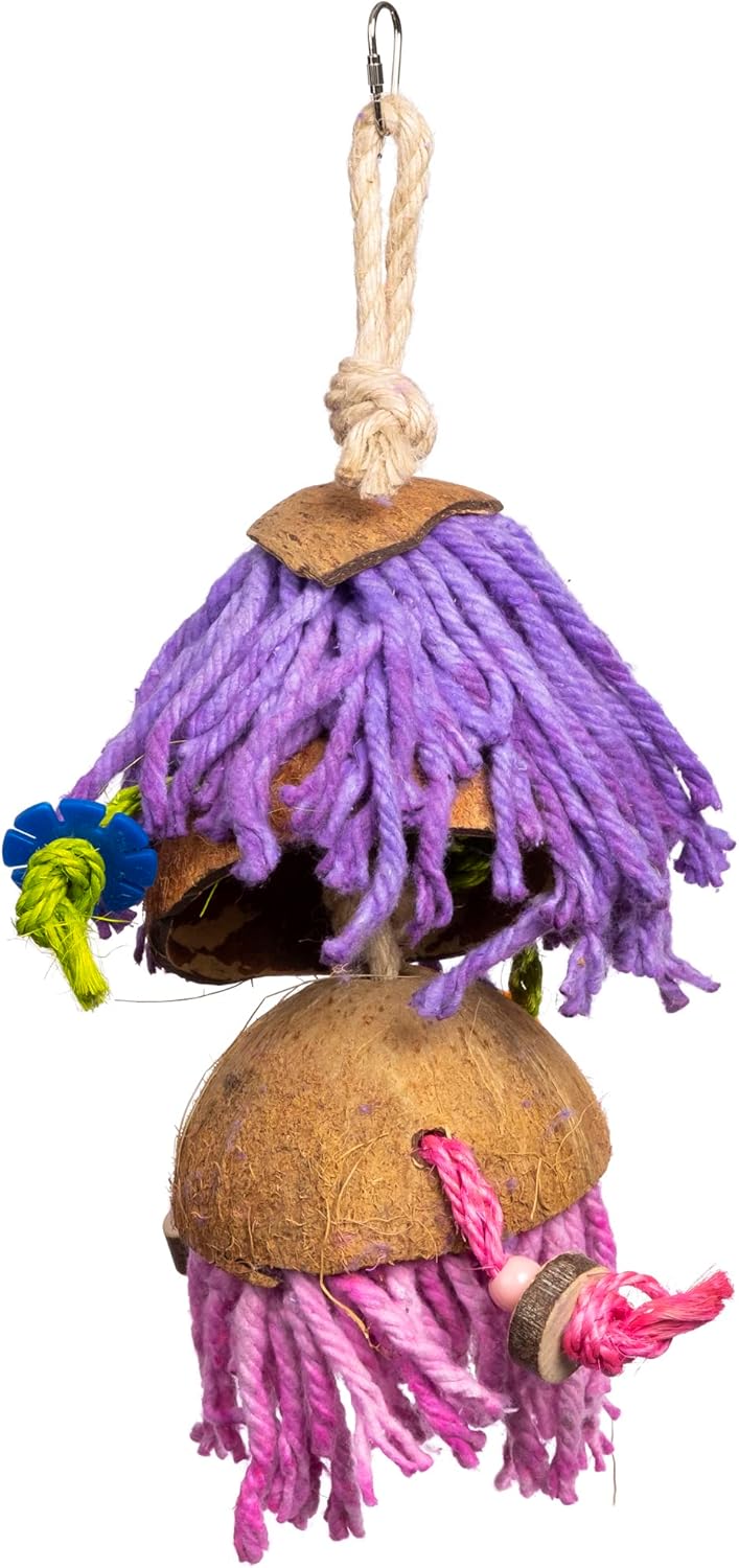 Coconut shells and Bamboo sticks provide a rugged texture for beak and tongue exercise